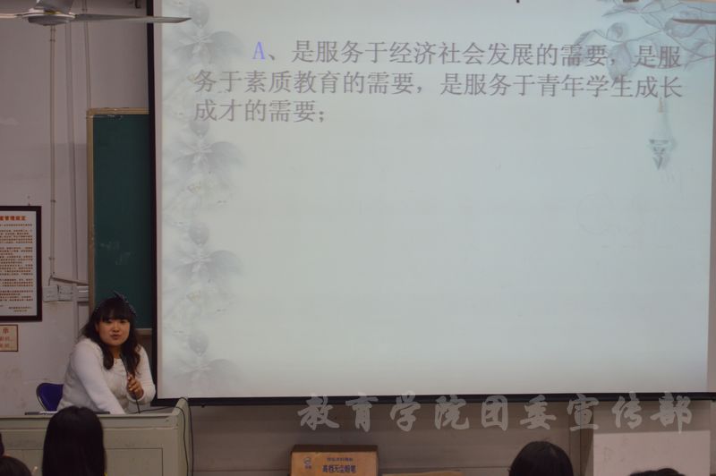 此次培训由院学生会负责,素质拓展部作为主要承办部门全程组织会议。在轻松愉悦的气氛中学生会分管主席杨琪向大家详细介绍了素质拓展活动分类、分数算法、注意事项等几类在素质拓展中非常重要且常见实用的分类。