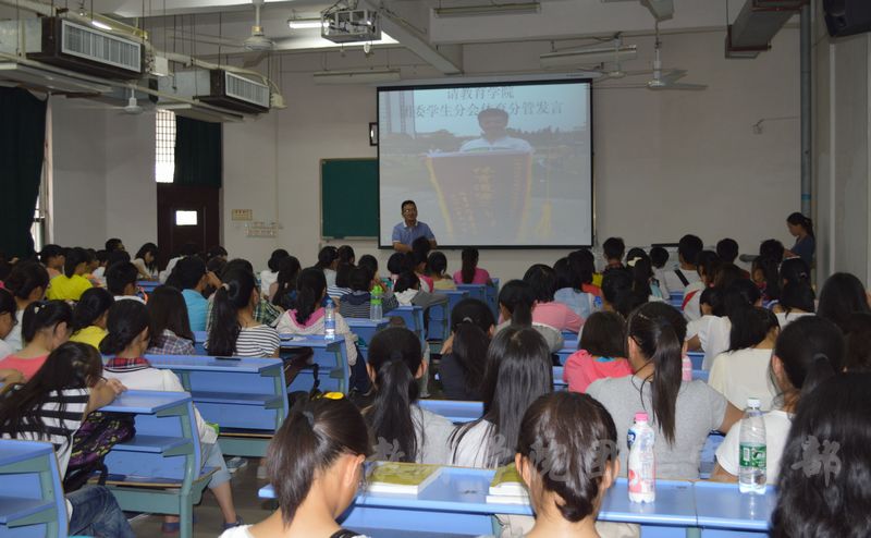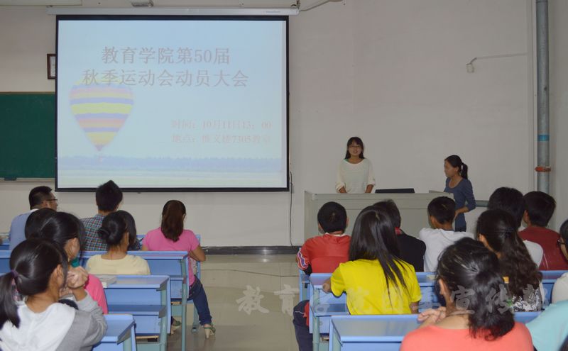10月11日中午1点,教育学院在惟义楼7305召开第50届秋季运动会动员大会,院党委副书记秦明鹏、团委书记李海红、2013级辅导员江海英老师和2013级辅导员杨欢老师出席本次大会,参加此次动员大会的还有院学生会、院党员服务站和院心理素质拓展协会的主要学生干部以及教育学院全体运动员。