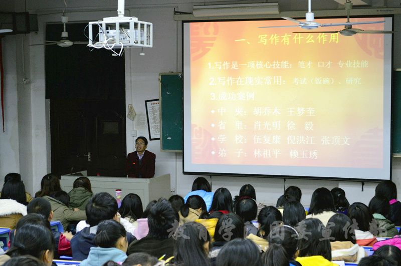 刘老师从写作有什么作用谈起,“写作是一项核心技能,它在现实应用有着极其重要的作用。”而后刘老师结合幻灯片就公文写作的基本文体和写作中应注意的问题作了深入浅出的讲解。同时,刘老师对于团学干部的素养与道德修养方面的问题也做了详细而深刻的论述,使同学们在自身责任感、道德修养、传统文化等方面有了更加深刻的认识与理解。