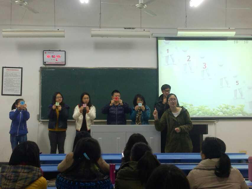 此次活动是以6个特教学生说课或讲课的形式进行,每人讲课时间为15分钟,说课时间为10分钟,其他特教学生则扮演听障儿童,模拟上课。最后一节课由启音学校老师点评,并根据自己的从教经验进行了专题讲座。清脆的上课铃声响起,我们的活动也正式的开始了。6位同学都为此次活动做了充足的准备,同学们一个接一个地在讲台上展示着他们的风采,有着初次尝试的紧张但更多地是享受着为人师表的快乐,同学们想用他们的智慧尽力地为孩子们创造一个轻松快乐的课堂,传授给孩子们更多地知识。扮演孩子们的同学也都积极响应,非常可爱!老师们给了令我们受益匪浅的点评,他们客观的评语让同学们知道了自己的不足之处,同时从中也获得了许多鼓励和前进的动力。