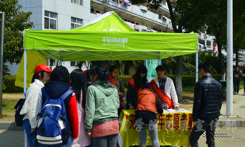 在人群中我们可以看见我院蓝心服务队的小红帽们,在耐心地为同学讲解此次活动的细则;也可以看见慕名而来的同学渐渐增多,许多同学正在填写报名信息。这次的宣传活动十分成功,就第一天宣传活动结束后的不完全统计,一天内全校报名人数达700多人,十分可喜。