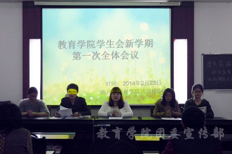 2014年3月23日晚6:40,教育学院学生会第一次全体会议在洁琼楼S401召开。本次大会由学生会组织部主要负责,组织部部长王青担任主持人,学生会全体成员参加了此次大会,为新学期的学生会工作积极筹备。