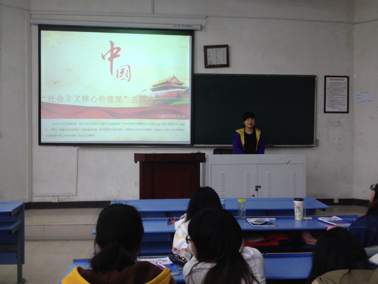 2014年4月24日上午10点,教育学院12级学前2班在惟义楼W5104召开了以“社会主义核心价值观”为主题的班会,学前2班班长熊萍主持会议,辅导员孙会明参加了此次班会。
