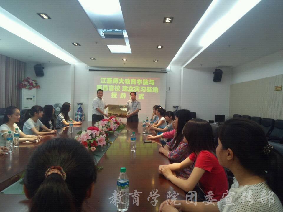 2014年5月28日上午8:20,江西师范大学教育学院2012级特殊教育的全体学生们在教育学院党委副书记秦明鹏和特教老师赵梅菊的带领下到南昌盲校举行实习基地的挂牌仪式,南昌盲校校长张虎根及盲校其他领导共同出席了此次挂牌仪式。