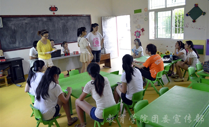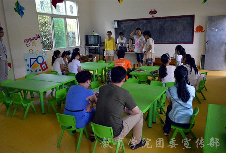 没有幼儿学生,没有专业老师,有的只是一群充满青春热血的暑期社会实践队员。演示课堂上,担任教学老师的王洲萍同学,看着台下一群大龄“幼儿”学生,用生动而甜美的语言开始了授课,讲台下的队员们,用稚嫩的童真表演将团队的合作魅力尽数展现。教育学院团委书记李海红亲临课堂现场,坐在教室后面观看演示课堂,并针对此次课堂的效果,提出了独到的见解。