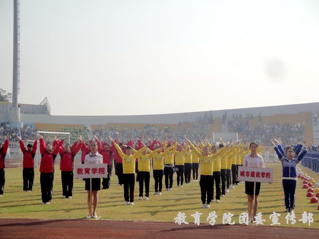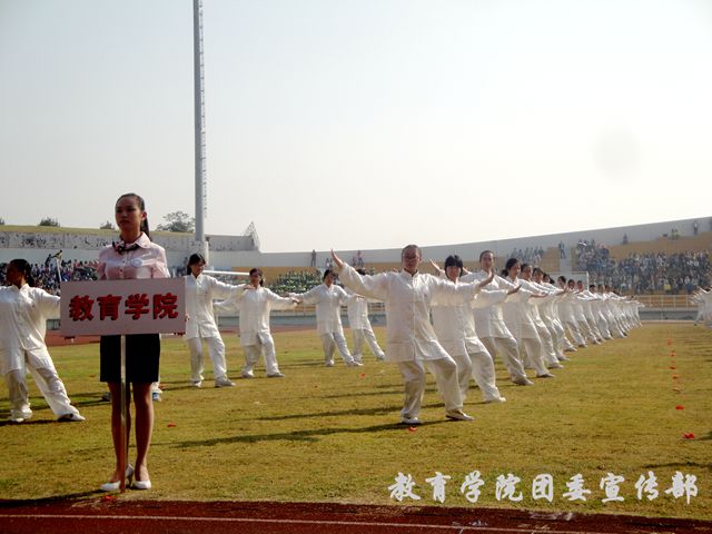 精彩的方阵表演,是令人期待已久的集体项目比赛。随着音乐的节拍,经历长达半个月训练的教院队伍整齐踏起步伐,个个精神饱满,动作到位,灵动活泼,激情四射,展示着他们的阳光活力。广播体操方阵有序退场之后,太极拳队伍吼着响亮的呐喊奔跑入场。音乐轻柔背景下,教院参赛队伍动作整齐划一,柔中带刚,连绵不绝,一次次的转腰迈步画出运动场上的一道道漂亮弧线。看台观众除了呐喊拍掌,更是利用动感十足的啦啦操为本学院的参赛队伍鼓舞士气,本次开幕仪式在太极拳表演的退场中步入尾声。
