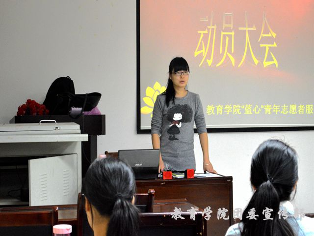 2014年10月11日晚19点于教育学院402,我院学生会蓝心服务站召开爱心支教动员大会。本次大会由蓝心服队队长何芳芳主持,分管主席王州萍,蓝心服务队全体学干及志愿者出席本次大会。