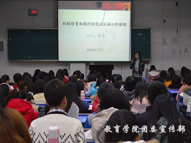 为增强同学们对社会主义核心价值观的认识,教育学院于11月25日下午在惟义楼W7104教室组织开展了以“积极培育和践行社会主义核心价值观”为主题的形势与政治讲座。此次讲座的主讲人为教育学院14级辅导员曹烨老师,教育学院13级全体学生参与聆听了本次讲座。