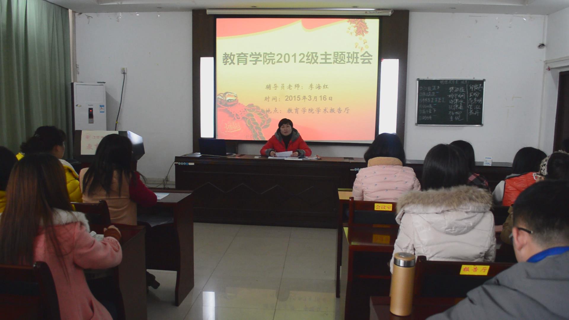 2014年3月16日中午,教育学院12级辅导员李海红老师在教育学院S401召开2012级主题班会。教育学院2012级公共事业管理班、学前教育一班,以及学前教育二班参加此次班会,与李海红老师就班级事务、学习生活进行了亲切交流。