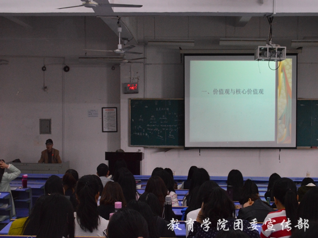 为增强同学们对社会主义核心价值观的认识,教育学院于4月11日下午2点在惟义楼W7201教室组织开展了以“大力培育和践行社会主义核心价值观”为主题的形势与政治讲座。此次讲座由政法学院的赖亦明教授、博士主讲,教育学院13级全体学生参与聆听了本次讲座。