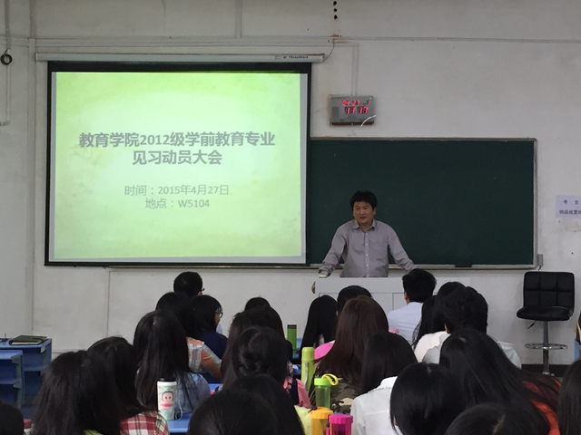 为增强同学们对见习工作的了解,提高专业技能,教育学院于4月27日11点20分在惟义楼5104教室组织召开了2012级学前教育专业见习动员大会。出席本次动员大会的领导有万文涛院长、裘指挥院长、秦明鹏书记及部分教育学院老师。大会由团委书记李海红老师主持,12级学前教育专业全体同学参与聆听。