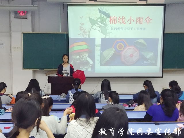 2015年4月24日晚,由教育学院手工艺社团组织开展的棉线雨伞授课活动在惟义楼7102教室组织开展。此次授课活动由手工艺社团学干覃子桃主讲,手工艺社团全体学干参与其中。
