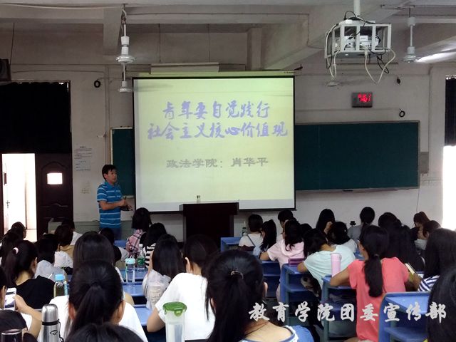 为积极响应党的号召,帮助大学生树立正确的社会主义核心价值观,培养正确的人生观、价值观、世界观,6月2日下午2点,教育学院在惟义楼7303教室开展了形势与政策讲座。我院特邀政法学院肖华平老师担任主讲人,教育学院2013级辅导员江海英、杨欢老师组织同学们听取本次讲座,全场座无虚席。