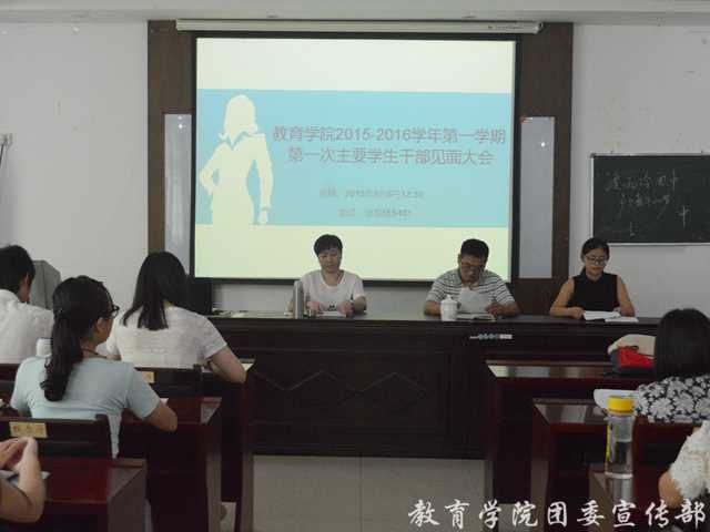为增进新一届学生干部之间的交流与联系,使日后的学生工作顺利进行,教育学院于9月8日中午12点30在洁琼楼s401教室召开了2015~2016学年第一学期第一次主要学生干部见面大会。本次见面会由学生会主席熊晶晶主持,党委副书记秦明鹏、团委老师李海红出席。