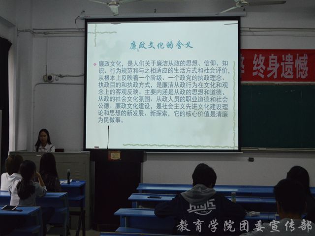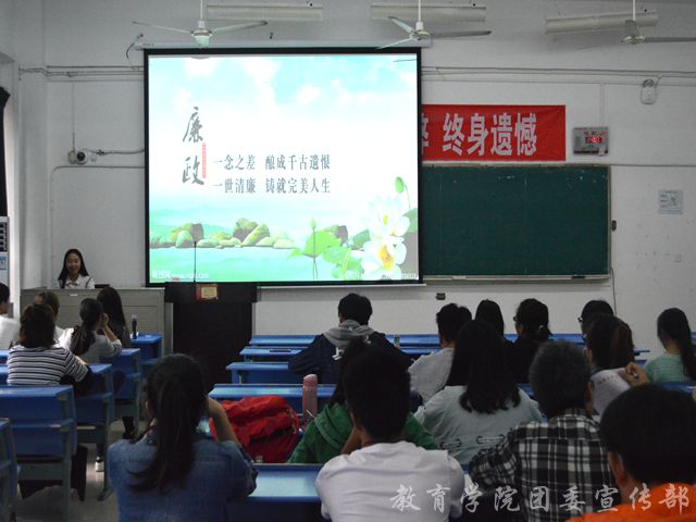为进一步加强我校廉政文化建设,促进学校工作全面发展,教育学院自律部、手工艺部及各班班委4月15日下午两点在惟义楼2201举办了宣传廉政文化的活动,此次活动由自律部学干李娅丽主持,教育学院广大学生积极参与。