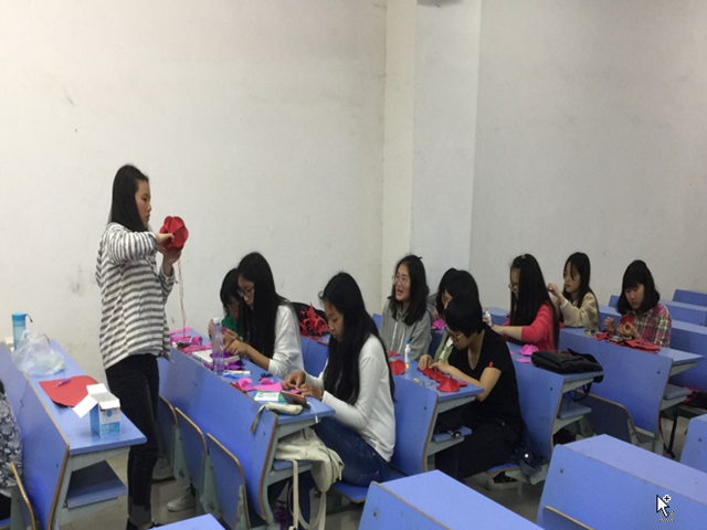 当天晚上同学们都早早地来到教室,迫不及待地等着亲手制作花灯。此次班会由纪检委员倪雨红主持。和同学们讲了廉洁的知识和花灯制作的理论知识之后,纪检就开始给大家发放制作灯笼需要的物品。在所有需要的东西都准备好之后,同学们期待已久的环节终于要来了。第一步是将各自手中的圆作为模板在卡纸上画出二十个圆,并剪下,然后将每一个圆平分为三等分,两点相连形成一个三角形,接下来可以在三角形内画上你喜欢的图案并用小刀刻下,再按照线条,微微折起,重复以上步骤,将二十个圆分别做成,做好粘和准备,紧接着双股线传入还未粘和完成的花灯中,最后将花灯的另一部分粘和,并在底部系上流苏作为装饰。花灯制作过程中,同学们以寝室为单位,互帮互助,体现出了同学们的团结协作的精神。