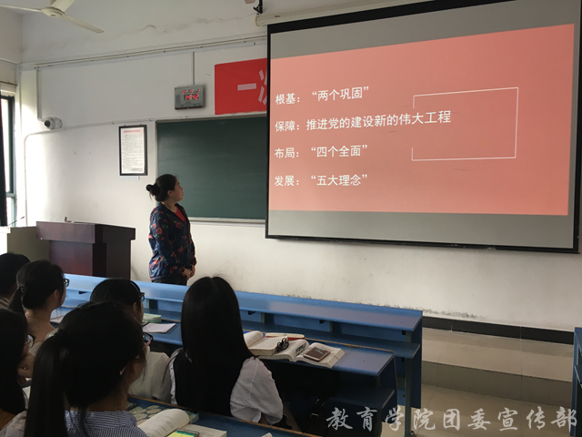 此次会议,14级公共事业管理班团支书徐添骄带领全体团员学习了《关于在全市共青团系统集中开展“学习总书记讲话,做合格共青团员”教育实践的通知》,她全面的向大家展现了全体共青团员中集中展开“一学一做”教育实践活动的重要意义,并且指出作为共青团员,要紧密地团结在以习近平同志为核心的党中央周围,牢固树立“四个意识”。最后,她鼓励团员们积极自觉地参与到“一学一做”教育实践中去,撸起袖子加油干。