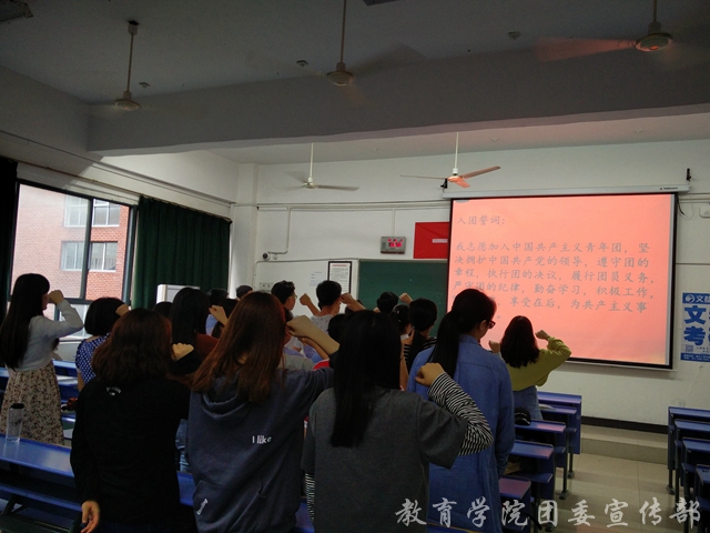 首先,团支部书记冯家琪介绍了本次的共青团员主题班会的学习内容共分为“学习习近平总书记,做合格团员”、“怎样做一名合格团员”主题团课学习以及重温入团誓词三个部分,随后开始对“一学一做”教育实践这项紧跟习近平总书记系列重要讲话精神面向共青团的举措进行讲解,强调做好一名合格的共青团员要学习革命先辈和先进典型,保持积极向上的精神面貌,不断的开拓进取。紧接着,在团支部书记冯家琪的带领下,团支部全体成员积极讨论“合格团员的标准”,分享自己的观点,并且一起回忆入团经历,现场氛围融洽。此次班会的尾声,由班长郑柯岩带领大家重温入团誓词,团支部全体成员宣誓,班会至此全部结束。