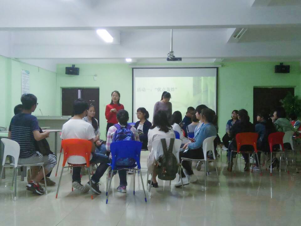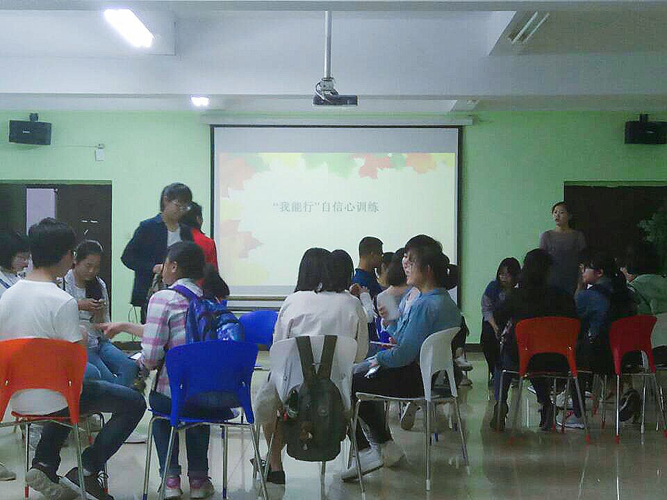 本次活动主题为"`我能行`自信心训练",共分为"优点轰炸"、"猜一猜"、"积极赋义"三个环节。首先,同学们以小组方式坐成两圈,轮流上台,由台下同学指出其优点,进行"优点轰炸"。本环节主要目的在于使大家发掘到自己更多的优点,增强自信心,通过他人的眼睛认识到更为全面的自己。而接下来"猜一猜"环节则由每位同学进行自我评价,分为优点、缺点两大类。组织人对着所有人念出个人总结,并由小组成员判断出该优缺点的主人。成员们的心灵距离在游戏中越拉越近,气氛相当融洽。在游戏的最后环节"积极赋义"中,各成员针对其他组员的缺点结合自身经历,提出积极有效的解决方法,互帮互助,解开各自的内心疑惑与生活学习上的问题。美好的相处时光总是过得飞快,在同学们的欢声笑语中,本次团辅活动也接近尾声,活动最后,心理联络员与同学们分享了此次活动中的感受与收获,并对该次活动进行了总结,表达出了对下次团辅活动的期待。