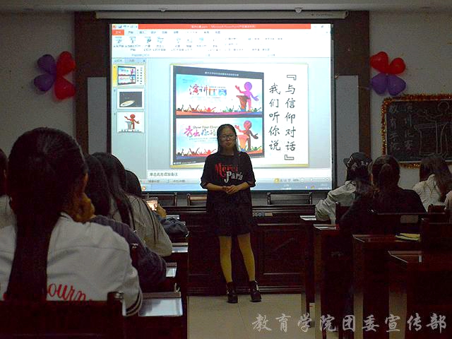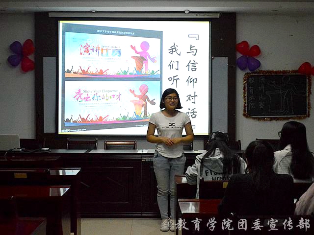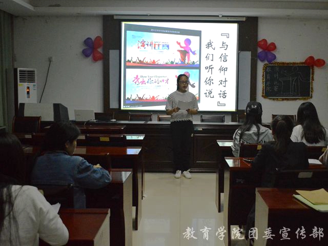 5月5日19:00,教育学院在洁琼楼S401 开展了以“与信仰对话”为主题的演讲比赛。此次比赛由职协学干陈润润担任主持人,职协会长黄樱、学生会组织部部长冯家琪、素拓部部长陈双福和文艺部部长王金星担任评委,教育学院15、16级学生参赛。