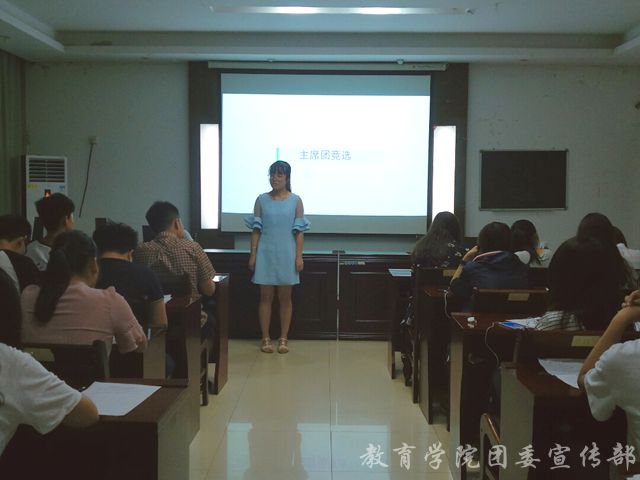 为进一步充实院学生会力量,打造一支高素质学生会干部队伍,经团委副书记曹烨老师与学生会成员商讨决定对院学生会主席团成员进行换届调整。6月2日晚七点,教育学院学生会主席团换届竞聘会在洁琼楼401召开,此次大会由组织部的学干黄娟娟主持,团委副书记曹烨以及各主席团成员、竞聘人员出席。