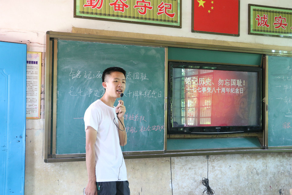 “你们要铭记历史、努力学习,让蒙山富强起来,让祖国富强起来。警钟长鸣,吾辈自强!”队员范维慷慨激昂地向同学们发起号召。走进教室,一堂绘声绘色的历史课开始了。范维利用多媒体教学,梳理抗日战争的重大事件,向孩子们讲解七七事变以及和蒙山息息相关的上高会战等历史事件,介绍宋哲元等抗日爱国将领。当范维说道“80年前的今天,1937年的7月7日晚上,日军侵略者制造了震惊中外的卢沟桥事变!南京大屠杀中日军屠杀30万人!”孩子们目瞪口呆,“30万!”他引领孩子们齐读梁启超的《少年中国说》,告诉孩子们历史不容改变,更不容忘记,革命先辈们用鲜血和生命捍卫着祖国的主权,让她不再受侵害。通过播放电影《英雄王二小》,孩子们更加直观地了解了当时中国的境况和惨痛的历史。落后就要挨打,范维向同学们提出希望,在和平年代里牢记耻辱,一步一个脚印,戮力前行,为实现中华民族伟大复兴的中国梦而努力奋斗!