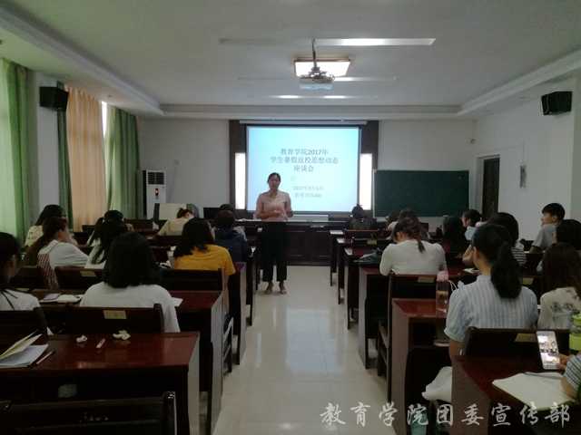 会议伊始,曹烨老师就学生会内部事项发表了讲话,指出要对学生会的人事进行调整,要求各部长做好部门的迎新工作以及修改和实施暑假计划,强调加强学生会各成员的纪律观念。同时,曹烨老师就教育学院2017年暑假返校思想动态开展现场座谈会,同学们上台踊跃发言,各放异彩。在迎新方面,学生会主席郑柯岩做了相关工作程序的介绍,提到线上线下迎新,做好充分准备。同时,为加强学生会各成员的能力,学生会主席郑柯岩相应地对在座的进行了公文培训,确保书写活动策划书基本格式和排版的正确性,也让同学们对公文写作有了新的认识。在宣传工作方面,分管主席郭卉昕讲解了宣传需要注意的各类事项,呼吁各部门要相互配合宣传工作的开展。