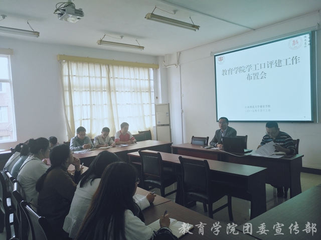 为迎接江西师范大学本科评估、促进学科建设,2017年10月13日下午2:30,教育学院学工口于学院421会议室开展迎评促建布置工作会议。会议由院党委副书记秦明鹏主持,出席会议的有分管教学工作的裘指挥副院长、院团委书记曹烨,学院各年级辅导员、班主任及学生组织学生负责人参与本次工作会议。