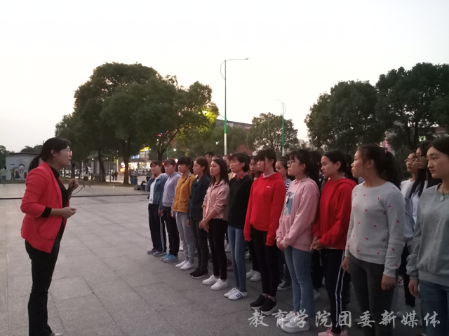 为认真响应落实国家“阳光体育运动”的号召,进一步了解教育学院广播体操参赛方阵的训练情况及训练成果,10月26日下午,教育学院团委书记曹烨、学生会主席郑柯岩及其余学生会主席团成员对在图书馆前广场训练的广播体操参赛方阵进行检查指导和交流慰问工作。