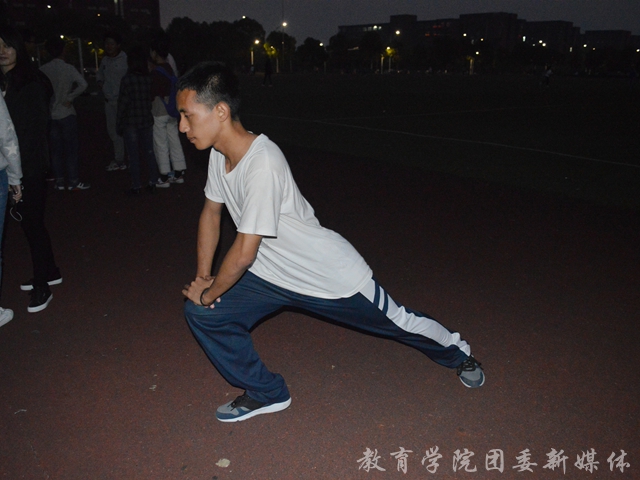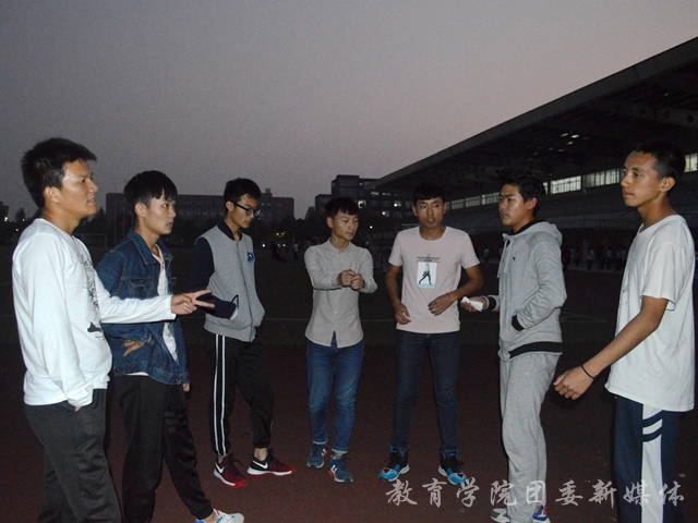 为了在秋季校运会上取得更好成绩, 11月1日傍晚五点四十教育学院参加4×100m接力赛的选手们在长胜体育场集合,进行赛前训练。本次训练由教育学院学生会组织部组织,全体4×100m接力赛的选手们参与。