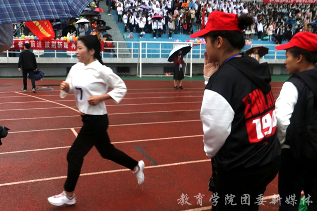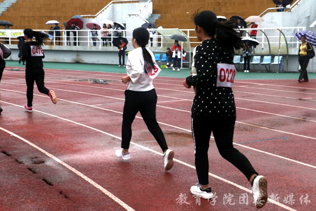 比赛开始前,运动员们认真做着准备工作,压腿、拉筋、活动关节,使身体调整到最佳状态,为接下来的长跑打好了基础。然后,运动员按照顺序站在跑道上,目视前方,等待征途的开始。随着一声枪响,比赛正式开始,跑道上时刻准备着的参赛队员们,如离弦之箭,将早已积蓄的力量在顷刻间发挥出来。在赛道上跑出一抹靓丽的风景。拉拉队卖力地跳着热情似火的舞步,带动了全场气氛。观众席上的同学们激动地起立,并忘情地大声呐喊加油,想要将自己的一份力量传递到运动员的身上。空中飘下的雨点,并不能阻挡运动员的脚步。迎面而来的冷风,吹不走大家的热情。一圈,两圈,三圈......十二圈半,终于在教育学院同学们的期待中,段丹丹同学凭借坚强的毅力到达了终点。