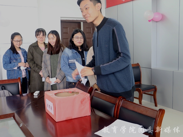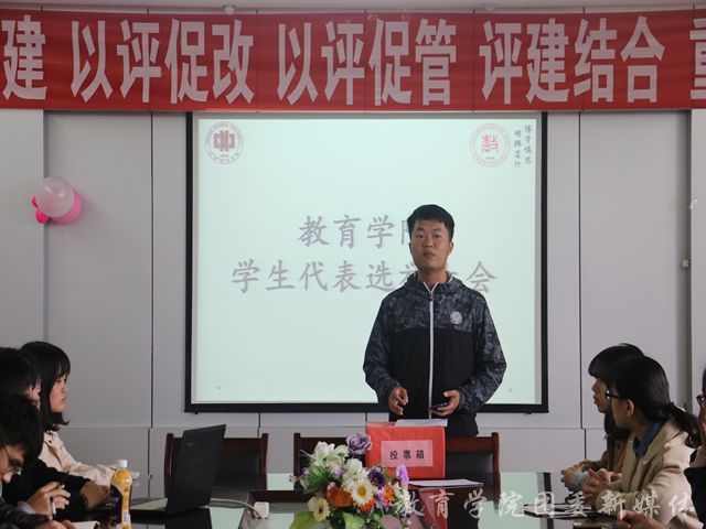 会议伊始,学生会主席郑柯岩率先发言,希望各位候选人能够充分表现自己,展现自己的综合素质和各方面能力,从而选举优秀的学生代表教育学院全体师生的利益。进入候选人演讲拉票环节,候选人按次序对学校现阶段工作存在的不足、问题发表自己的看法、意见,以及对如若被选举成为学生代表之后如何工作做出真挚的承诺。整个演讲过程流畅,各个候选人也准备得十分充分,极力展现自我。经过认真聆听各位候选人的演讲,老师和学生会干部对所有候选人有了大致的了解,并对每个候选人进行全面的仔细分析。本次选举一律采取无记名投票的方式,秉承公平公正公开的原则。全体在场人员认真对待选票,投票工作依次有序地进行。评选工作结束,主席郑柯岩当场宣布评选结果,评选出九名优秀的学生代表。宣布完毕,全体在场人员发出阵阵掌声对成功竞选为学生代表的同学以示祝贺。曹烨老师进行发言,谈及作为一名优秀的学生代表的权利和义务,并对学生代表提出严格要求。最后,该次选举会议圆满结束。