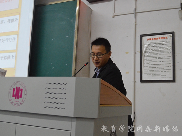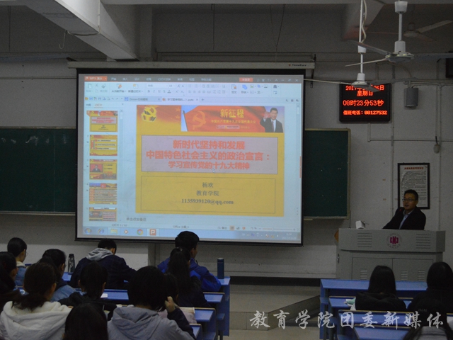 为深入贯彻落实党的十九大精神,教育学院于11月26日上午八点三十分在惟义楼7204教室开展了一堂关于学习贯彻党的十九大精神的形势与政策课。此次的课程由杨欢老师主讲,教育学院17级全体同学共同参加。现场气氛活跃,老师耐心讲解,同学认真聆听。