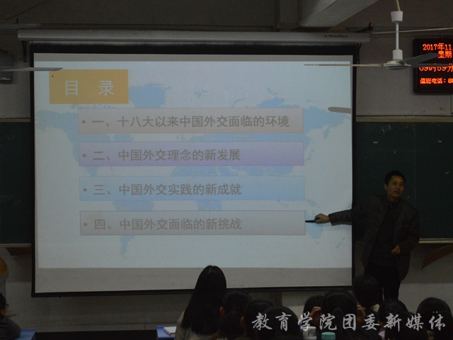 为增强同学们对世界基本态势的了解,培养同学们的大局观,11月26日十点,在惟义楼7203教室,教育学院17级全体同学聆听了主题为“砥砺奋进的五年——十八大以来的外交”的形势与政策课,主讲人为左功业老师。