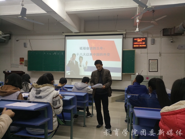形势与政策课是高校思想政治理论课的重要组成部分,是对大学生进行形势政策教育的主要渠道。为加深大学生对于当前大国关系和国际形势的认识,提高今后面对世界的分析能力。11月26日晚七点,教育学院“砥砺奋进的五年——十八大以来中国的外交”为主题的形势与政策课在惟义楼7204教室举行,本次形势与政策课由左功叶老师主讲,教育学院16级全体同学共同参加。