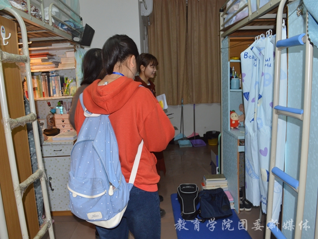 为响应十九大习近平总书记、李克强总理关于安全生产系类重要指示批示精神,深入排查安全隐患问题,切实提高师大学子安全意识,发扬文明新风,倡导大学生创造干净整洁以及富有创意的生活环境,更好的迎接我校的本科教学审核评估工作。11月27日晚九点,举行了第十六届安全文明宣传月系列活动之教育学院“文明”寝室评比活动,本次活动由学生会自律部组织,全体参与评比寝室共同参加。
