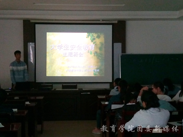 为加强新生安全意识,构建更加安全和谐的校园生活,17级公共事业管理班积极响应院团委号召,于10月21日13时在教育学院401多媒体教室举行大学生安全知识教育主题班会。本次主题班会由17级公共事业管理班班长王代祥主持,17级公共事业管理班同学全体成员参加。