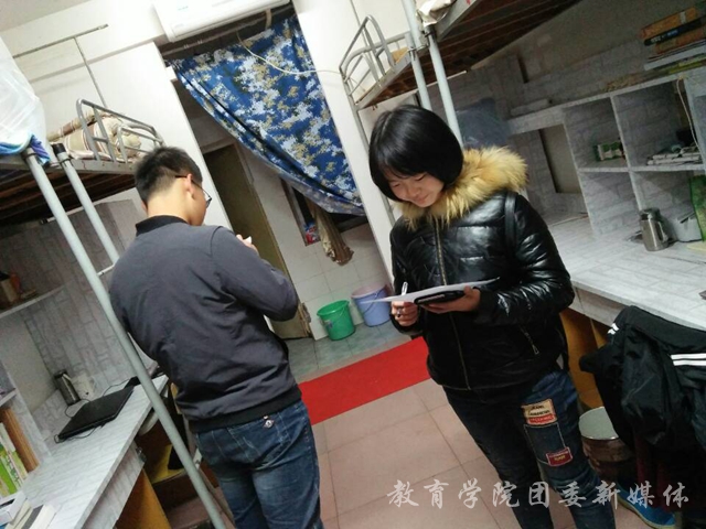 为切实提高学生的安全意识,将安全文化落实到每个班级、每个寝室,每位同学。教育学院于12月8日晚上六点进行了安全寝室评比活动,本次活动由教育学院学生会自律部主持,对每个参与评比的寝室进行评分。