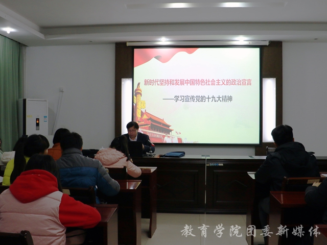 为了进一步学习宣传贯彻党的十九大会议精神,帮助青年学子更好领悟、理解十九大深刻内涵, 12月21日晚七点在洁琼楼401举行了学习党的十九大精神的专题讲座,由江西师范大学党委副书记刘光华主讲,教育学院学生会、党员服务站、心协部长及以上学生干部和各年级班长、团支书及15级部分班级的同学参加本次讲座。
