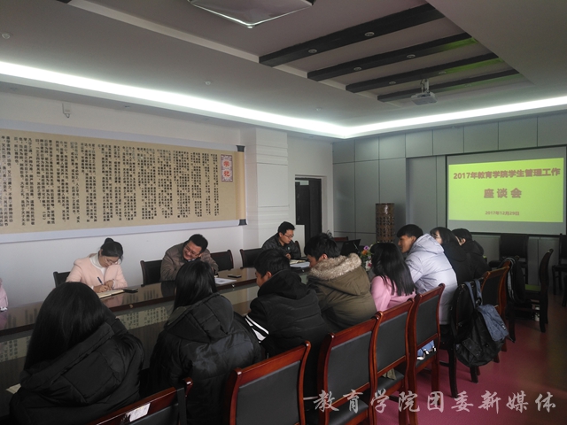 2017年12月29日上午10:30,教育学院于洁琼楼408召开2017年学生管理工作座谈会。座谈会由院党委副书记秦明鹏主持,各年级政治辅导员、各学生组织代表、班级代表出席本次座谈会。