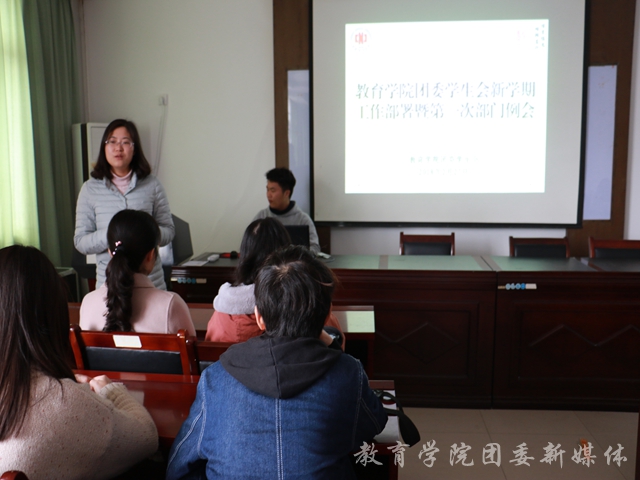 为部署新学期的工作和任务,2月27日下午1点,教育学院学生会在洁琼楼401报告厅召开了2018年第一次学生工作会议。此次会议由学生会执行主席郑柯岩主持,团委书记曹烨出席会议,学生会主席团及各部门正副部长参加会议。