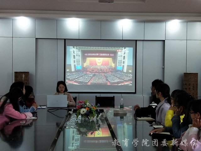 为深入学习贯彻习近平新时代中国特色社会主义思想,3月3日下午3点,于洁琼楼s408会议室组织观看“全国政协十三届一次会议开幕会”,本次会议由学生会组织部部长黄娟娟主持,全体参会人员共同参加。
