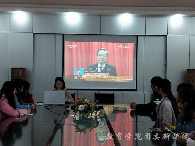 本次开幕式的主要议程为全国政协主席俞正声代表第十二全国委员会常务委员会作工作报告。俞正声将报告分为三个方面来做出阐述:一是五年工作的回顾;二是五年工作的主要体会;三是今后工作的建议。在观看 “两会”的时候,参会人员认真聆听阐述内容并仔细地在笔记本上做好记录。观看结束后,参会人员几几相与进行讨论学习,过后更是积极踊跃发言,发表自己对于本次观看“两会”的看法与心得,针对会议内容中涉及的不同方面进行讨论学习,展现了新时期青年的蓬勃朝气。最后,黄娟娟对于参会人员的讨论进行了汇总,让本次学习活动画上圆满的句号。