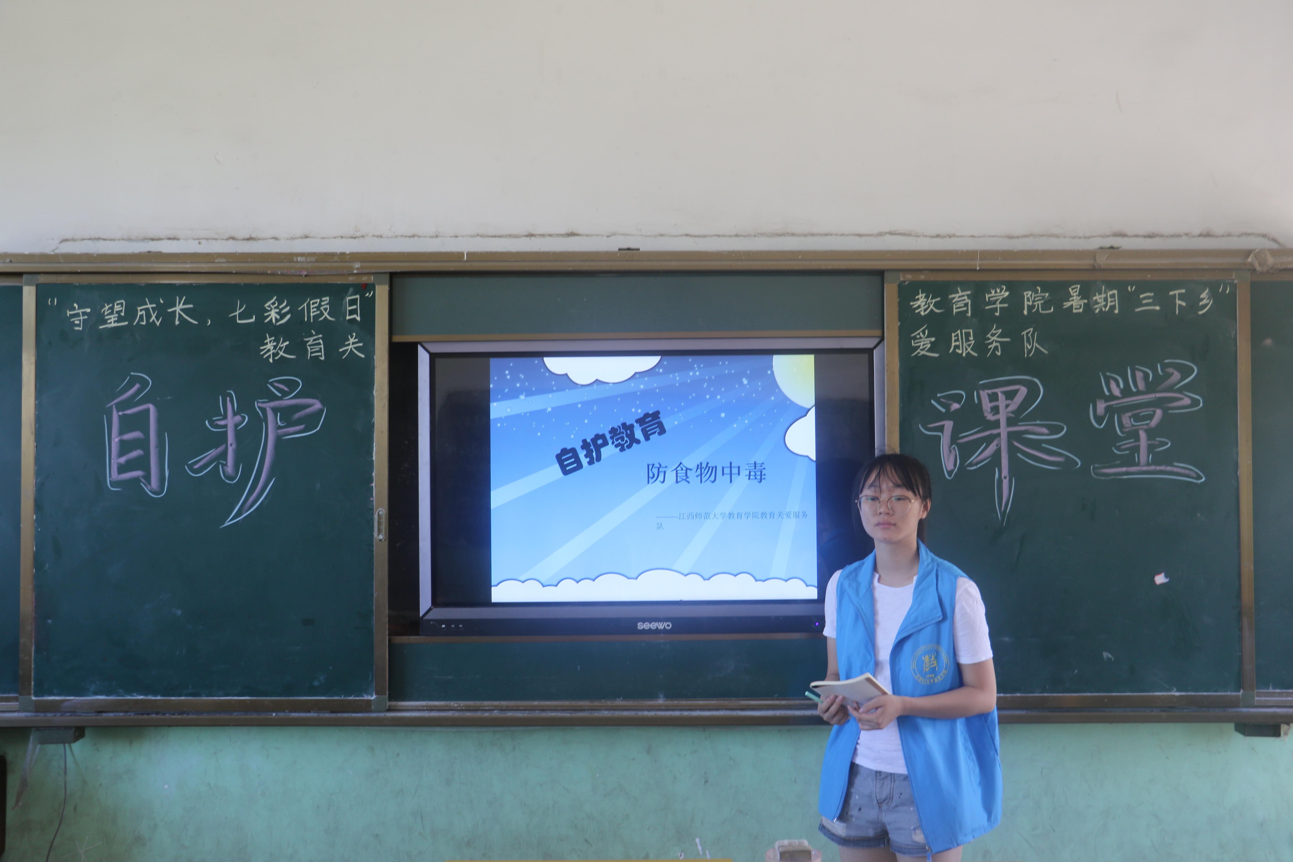 为了提升孩子们的食物安全和性安全意识,江西师范大学“守望成长,七彩假日”教育学院暑期“三下乡”服务队在7月11日上午于幽兰镇新庄小学开展了“防食物中毒”、“防性侵”两个方面的自护教育,课程内容由服务队成员杨洁同学讲解。