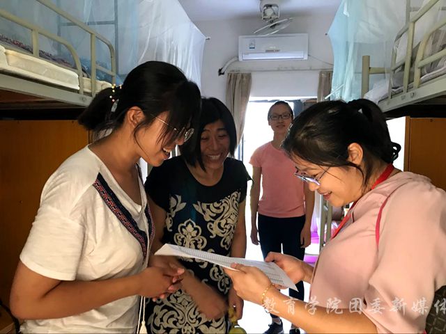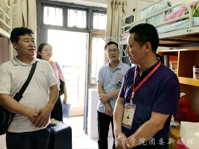 新学期伊始,为了解我院学生在校的住宿条件和生活状况,给同学们创造一个良好的校园生活环境,9月8日下午四点,教育学院党委书记赵顶兴、院务委员李箭、院团委书记曹烨、2016级辅导员乔宇超一行人逐一走访了教育学院本科生新生寝室,慰问每一位2018级本科新生。