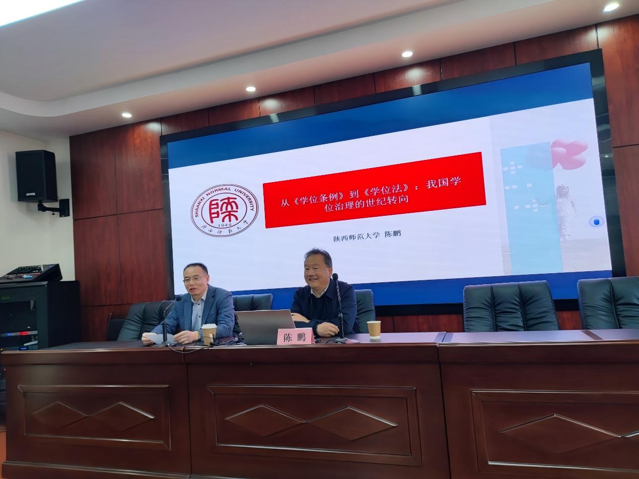 2025年12月2日,陕西师范大学博士生导师、陕西省基础教育质量监测与评估研究中心首席专家陈鹏教授应邀莅临瑶湖教育讲坛第35期。本期讲座主题为“从《学位条例》到《学位法》:我国学位治理的世纪转向”。教育学院部分青年教师、博士生、硕士生到场聆听。讲座由院长裘指挥教授主持。