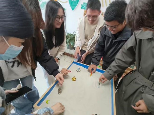 活动伊始,学院心理联络员晏彤以“沙具盲选”小游戏拉开序幕,快速消除成员间的陌生感,营造轻松融洽的活动氛围。全体参与者以非评判心态投入创作,分工协作、依次摆放沙具,共同构建“成长主题”沙盘场景,在动手创作中深化团队协作。场景构建完成后,每位成员逐一分享自身摆放沙具的初衷,成员间认真倾听,充分展现开放包容的沟通态度。