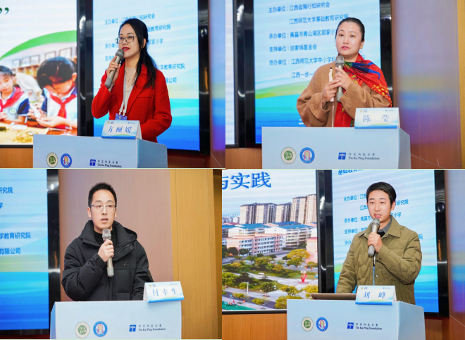 1月17日上午,第一阶段是教学成果专场分享,会议由江西省陶行知研究会副秘书长、江西师范大学中小学科学教育研究院院长谭菊华教授主持。本次共有8个教学成果项目进行分享:南昌市青山湖区胡家小学校长方丽媛作《以“中草药”为媒、践行“教学做合一”——一所村小的“三化”育人体系探索与实践》、南昌市龙泉实验幼儿园园长陈莹作《小脑袋、大能量:“三阶九步”解锁幼儿高质量项目式学习的奥秘》、南昌市育新学校九龙湖校区付幸生主任作《万物有科学:小学科创类课后服务课程群开发与实施的“红谷”探索》、吉安县海尔希望小学刘峰主任作《解码你的好奇心:小学“趣探”大科学课程体系协创与实践》、南昌市红谷滩区教师发展中心教研员时荣萍作《一体推进、三课并举、六维协同:构建“大思政课”育人新格局的县区实践》、南昌市红谷滩区凤凰学校校长陈小荣作《人人有“戏”:中小学“三线一体”京剧育人体系的十七年探索与实践》、南昌市站前路学校教育集团云海路校区副校长曹昌灵作《四化一体、五育融合:小学综合“食”践活动课程群开发的集团化探索》、吉安县君山小学中小学正高二级教师王林华作《三阶设课、四环成项、五自教学:小学校本化“劳综”课程的开发与实施》的教学成果分享。各分享单位立足本校育人支点,主要从从教学成果案例的“背景与问题”“解决问题的过程与方法”“成果主要内容与推广”等方面详细介绍,为与会陶友奉献了一场丰富的思想盛宴。