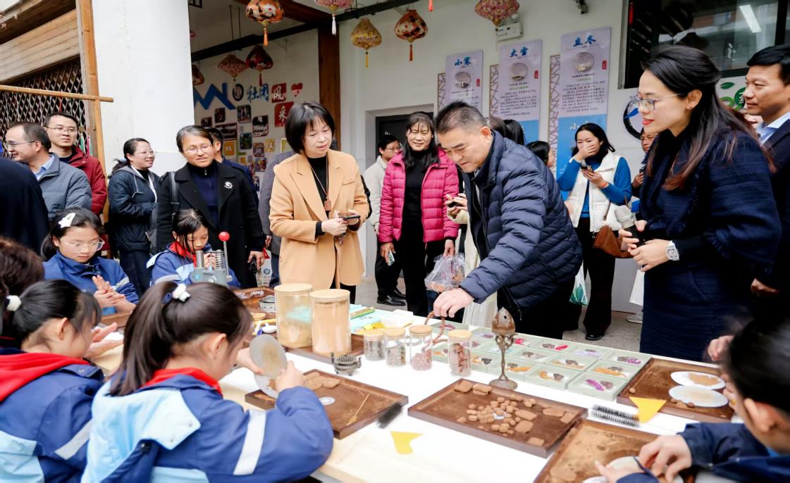 主旨报告结束后,省陶研会会长孙锦明教授全程陪同南京市浦口区行知教育集团总校长、中国教育学会副会长、国家级教学成果特等奖获得者杨瑞清先生夫妇,以及400余名与会的陶友代表共同走进胡家小学,实地考察“生·动”教育的实践场景。胡家小学践行“越做事、越懂事”的“校铭”主张,探索出一套以“进阶化、体验化、作品化”为主要特征的“中草药”育人体系,受到杨瑞清先生以及与会代表的高度赞赏。