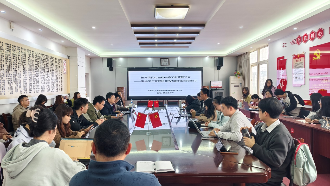2026年4月2日,华中科技大学教育科学研究院教授、华中卓越特聘教授、博士生导师刘长海应邀莅临瑶湖教育讲坛第39期,为教育学院师生以《教育现代化进程中的学生管理转型》为题作报告。讲座由教育学院副院长赵志纯主持。